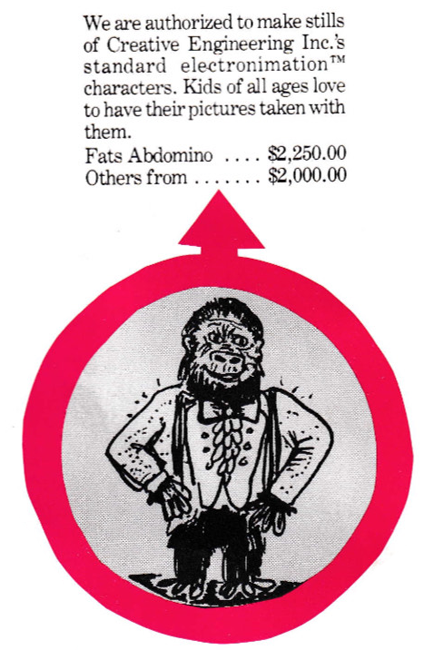 In the very beginning, Fatz was a member of an earlier animatronic group - The Wolf Pack 5. He was present at the first ShowBiz Pizza Place restaurant that opened in 1980, and at the time was called Fats Abdomino, or sometimes simply Fats Gorilla1. The last name "Abdomino" was a nod to the famous Fats Domino which he was modeled after - Fatz sang a parody of Domino's "Blueberry Hill" entitled "Banana Hill" that was used by both The Wolf Pack 5 and later the Rock-afire Explosion. When Fats became a member of the Rock-afire Explosion, his last name was chaged to "Geronimo". In late March of 1981, the spelling of his name was officially changed from Fats to Fatz (most likely for trademark purposes) and it was noted that his last name Geronimo would probably eventually be dropped2.
