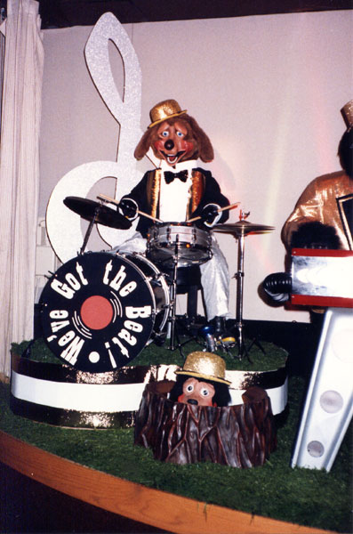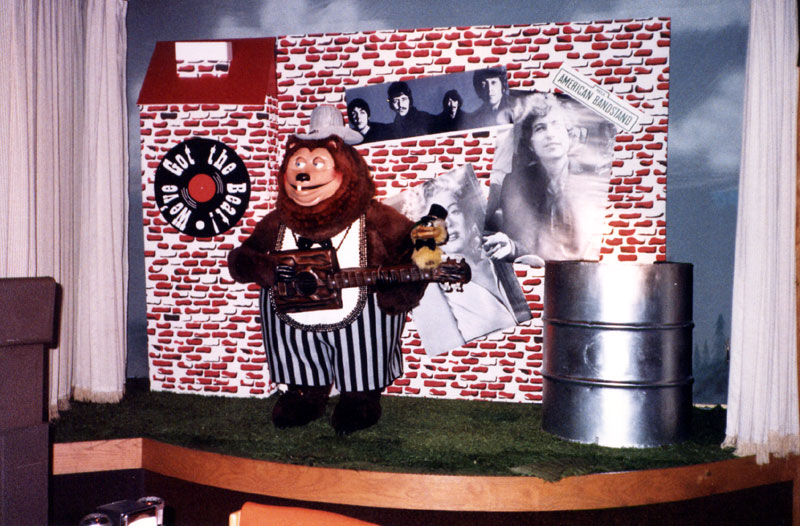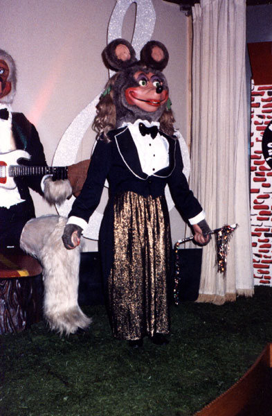 The Rock-afire stages were drastically altered - Rolfe and Earl's stage had a solid gold rain curtain, a jukebox, and music notes dangling from the ceiling. Gone from center stage was the forest and trees (except for the stump beneath Beach Bear and the one around Choo-choo). Instead, the center stage had a backdrop "screen" that a light show and assorted projections could be displayed upon. Rounding out the stage were two large treble clefs on each end. Billy Bob's stage had a brick house façade that was plastered with posters of famous musicians including the Beatles and Bob Dylan. Looney Bird's barrel was also painted chrome.