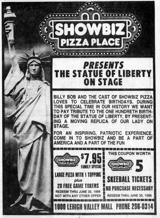 The Statue of Liberty was one of the most unique characters ever used in conjunction with the Rock-afire Explosion. The actual Statue of Liberty in New York was celebrating its 100th Anniversary in 1986, and ShowBiz Pizza Place wanted to do a tribute of its own. They decided to do this by installing their very own version of the Lady Liberty in each of the 170 ShowBiz Pizza locations nationwide1.