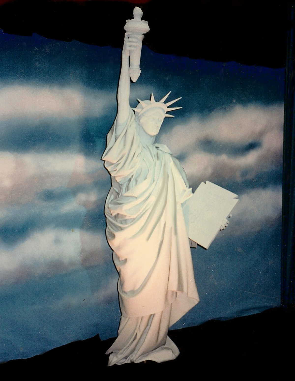 ShowBiz commissioned Creative Presentations, Inc. in March of 1986. CPI, with the help of mechanical designer Ralph Millard and costume designer Patti Whitmore brought Lady Liberty to life. The Statue was scaled down to 6' tall to match the size of the other characters, in fact, the animatronic mech beneath the cosmetics is that of Rolfe DeWolfe. ShowBiz felt it was best to go with a realistic appearance as opposed to an animated or characterized look - something that would maintain the dignity of the Statue as a national symbol. The only alteration that was made was the addition of a slight smile, to make her a little less intimidating to the younger children.1