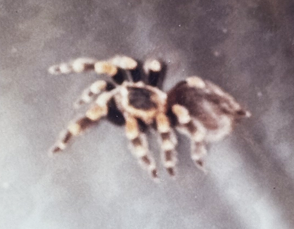 The 'Birthday Spider' Antioch was a supporting character for the Rock-afire Explosion. He was Fatz's pet spider and would drop down from the ceiling above the stage (between Dook and Fatz). He was named after the 1st ShowBiz Pizza Place1 that opened in Kansas City, MO - in the Antioch Shopping Center. He spoke in a garbled voice and was mentioned in showtapes beginning in 19842. While working at Creative Engineering, artist David 'Billy Bob' Irvin also had a pet spider that was named Antioch - and although long dead still exists preserved in a jar.
