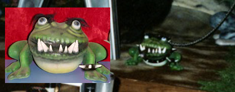 The Bad Frog was a character present only in the Classic Mini Stage version of the Rock-afire Explosion. He looked similar to the regular Frog, except he had gnarly teeth poking out of his mouth, black furry eyebrows, and darker markings painted on his skin. He was chained to a sign on the "Used and Abused Tars" prop that read - Beware Bad Frog. The gag was that instead of having a guard dog protecting Smitty's, Billy Bob would instead have a "guard frog"11.