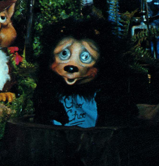 Choo-choo was the baby bear located in the stump near Dook's drum set. From time to time, he would pop out of the stump, and bounce to the music. Choo-Choo was named very early in the development of the Rock-afire Explosion, and in his earliest 'beta' design even had a bib with his name embroidered on it. Although Choo-choo never had a speaking voice, on the Trivia Night showtape he was named and introduced by the Rock-afire as the only character who had "never introduced a show before"3.