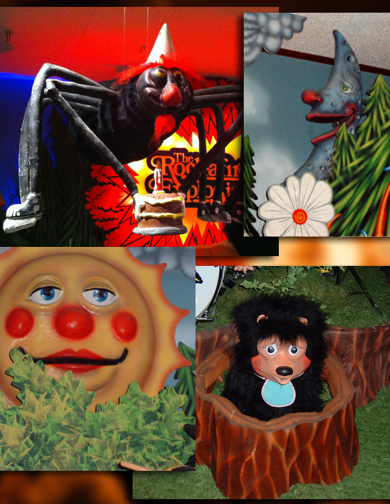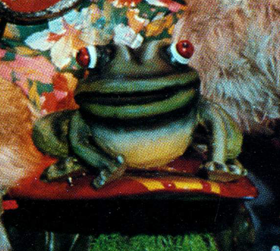 The Frog is another prop character. Early on, he was positioned on Beach Bear's surfboard. This was done for a specific reason - early versions of Frog had eyes that were attached by springs. When Beach Bear would rock back and forth the Frog's eyes would bounce around6. Originally Frog had red eyes but were later changed to blue. He was also moved to the stage floor and became a static decoration.