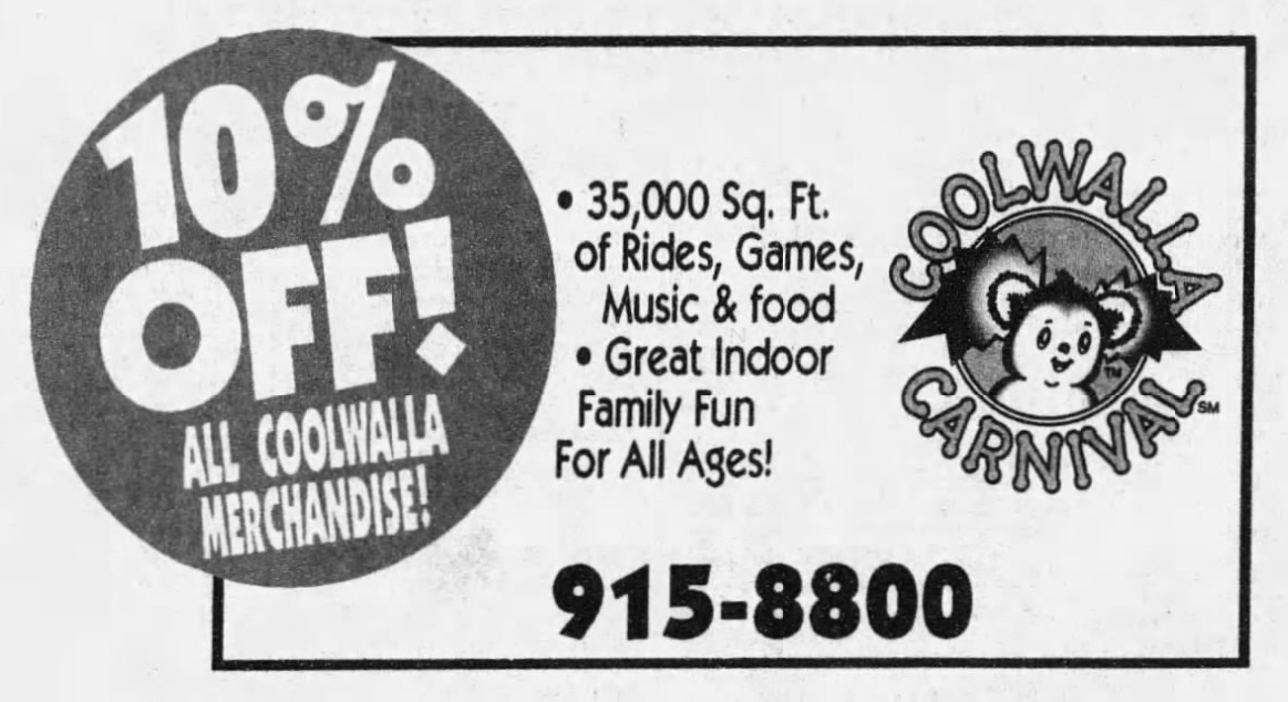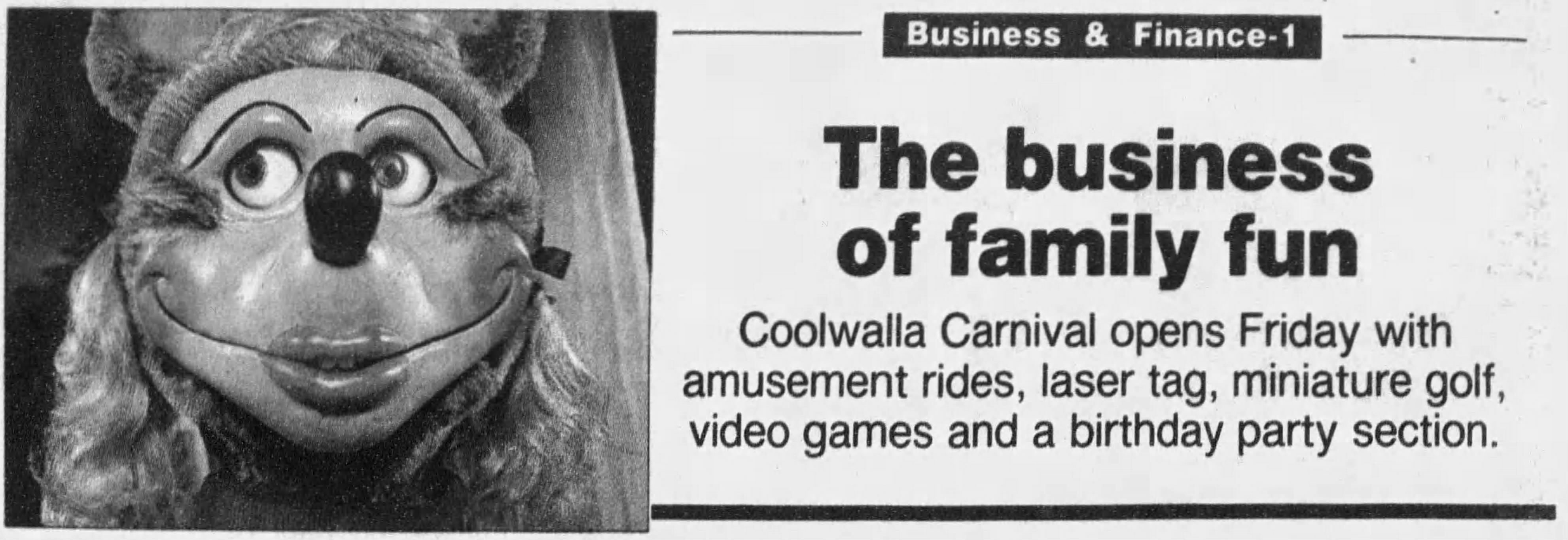Coolwalla Carnival was the brainchild of Frank Feitz, and featured a group of original characters known as the "Coolwallas" which were based on Australian koalas. The amusement center was themed to Australia, both in overall imagery but also with employees speaking Aussie slang to the guests. Although the business started strong and had major expansion plans, it ended up being quite short lived and closed within a few years of operation.