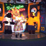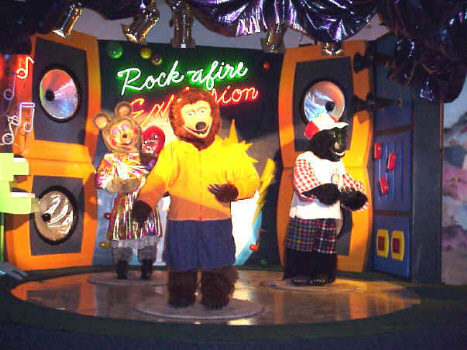 The show at Let's Fun was a full New Rock-afire Explosion, with a Karaoke add-on. The band was given custom outfits, most notably Beach Bear’s green and blue bowling uniform to go with the adjacent bowling alley. Fatz wore a Let’s Fun shirt, Mitzi wore a floral dress, Dook had yellow overalls and a hat, and Billy Bob was dressed in a yellow shirt with blue shorts. This show had no show selector.