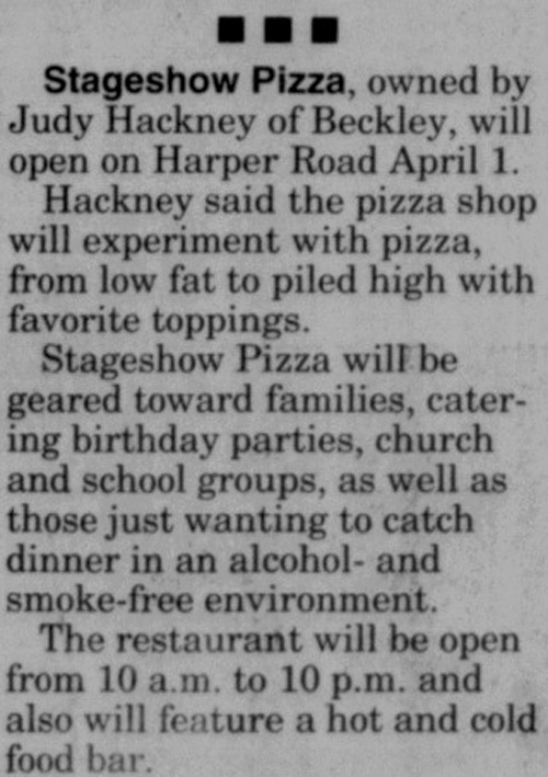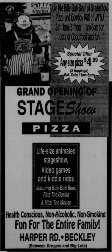 On April 1, 1995, Judy Hackney opened Stageshow Pizza in the former Heck’s building in Beckley, WV. The location would be advertised as catering to families and “those just wanting to catch dinner in an alcohol and smoke-free environment”. The store featured a Classic Rock-afire Explosion show along with a Show Selector, which was purchased for $100,000. Before opening, technicians sent by Creative Engineering spent more than a week perfectly adjusting and fine-tuning the band for its debut. Upon opening, the location was an immediate success. One newspaper article cites families and even a newspaper reporter singing along to “Heard It Through The Grapevine” by Beach Bear. Alongside the Rock-afire, the arcade boasted 40 arcade games and some children’s rides.