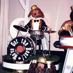 The Rock-afire stages were drastically altered - Rolfe and Earl's stage had a solid gold rain curtain, a jukebox, and music notes dangling from the ceiling. Gone from center stage was the forest and trees (except for the stump beneath Beach Bear and the one around Choo-choo). Instead, the center stage had a backdrop "screen" that a light show and assorted projections could be displayed upon. Rounding out the stage were two large treble clefs on each end. Billy Bob's stage had a brick house façade that was plastered with posters of famous musicians including the Beatles and Bob Dylan. Looney Bird's barrel was also painted chrome.