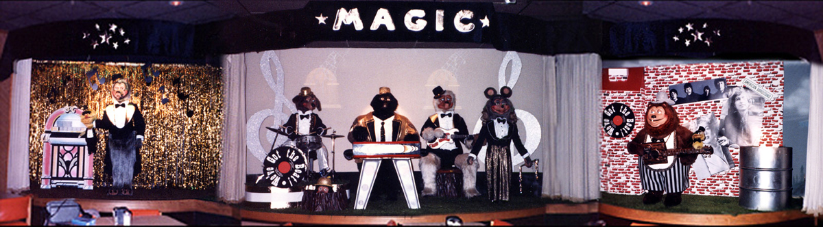 In the mid-80s, ShowBiz designed a 'new' Rock-afire stage, complete with new character costumes. It is tentatively known as the "Magic" stage, because of the printing on the center stage valance - although the stage better resembles a Bandstand / Variety Show.