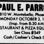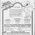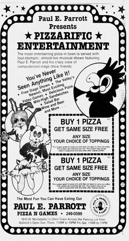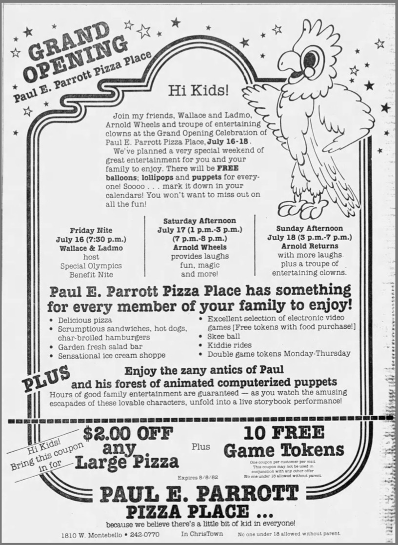 Paul E. Parrott Pizza Place opened on July 16th, 1982 at the Chris-Town Mall in Phoenix, Arizona. They had a grand opening celebration lasting from the Friday night of the 16th through Sunday, with local performers Wallace and Ladmo present for festivities. The restaurant went all-in on the concept; tons of electronic video games were available, pizza was served, custom tokens were minted, and an animatronic band entertained guests. By all accounts this was a classic early 1980s video pizza arcade, fulfilling its role of housing Mortronic’s games.