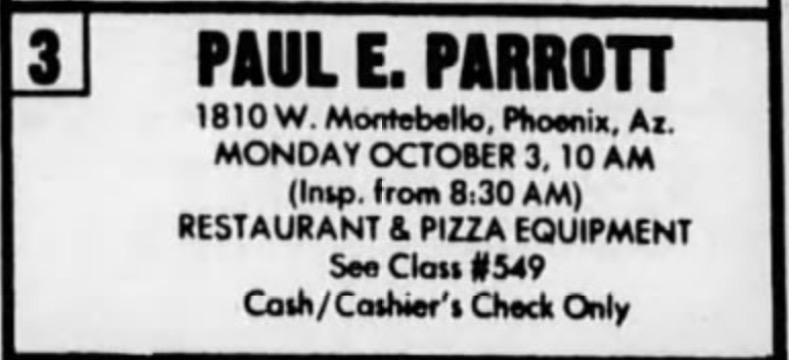 Paul E. Parrott Pizza Place (later called Pizza N Games) was a short lived animatronic pizza restaurant in Phoenix, Arizona. It is notable for only lasting a little over a year, and having no known photos or video of the animatronic band or restaurant interior.