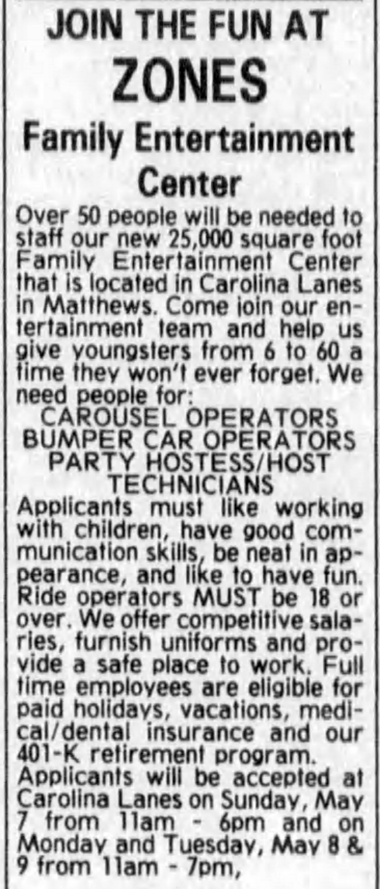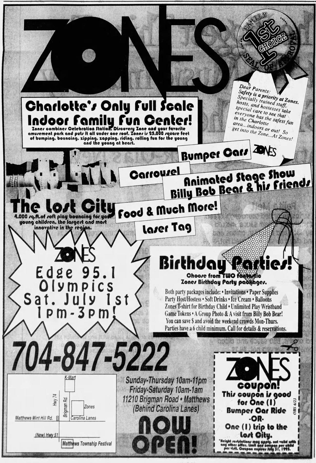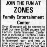 Carolina Lanes opened up at 11210 Brigman Road in Mathews (Charlotte), North Carolina in January of 1994. It was owned by Charan Industries, a company that operated many bowling and entertainment centers, such as the nearby University Lanes. Just over a year after the bowling center opened, the expansion area called Zones opened in June of 1995. Name dropping the similar Discovery Zone and Celebration Station in its ads, Zones aimed to be the one stop family entertainment center of the Charlotte area, combining food, activities, and an animatronic show all under one roof. They advertised their animated stage show with “Billy Bob Bear & his friends” right from the start.